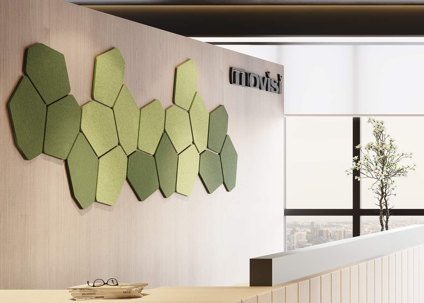 Die HUSH Akustikplatten von MOVISI bestehen aus dem Material MOVISI SONIC und sind ein Design Vorbild für den nachhaltigen, produktiven Arbeitsplatz von heute. Wesentliche Vorgaben an einen Arbeitsplatz heutzutage sind der effektive Umgang mit Lärm und die Nutzung klimafreundlicher Materialien. Sämtliche Baumaterialien haben gewisse akustische Eigenschaften, da sie entweder den Schall im Raum absorbieren, reflektieren oder weiterleiten. Die akustische Leistung hängt hauptsächlich von der Struktur des Materials ab. Je offener die Struktur, desto leistungsfähiger. Die filzähnliche Konstellation von MOVISI SONIC ermöglicht, im Gegensatz zu harten Materialien wie Holz oder Glas, die Absorption von möglichst vielen Schallwellen.